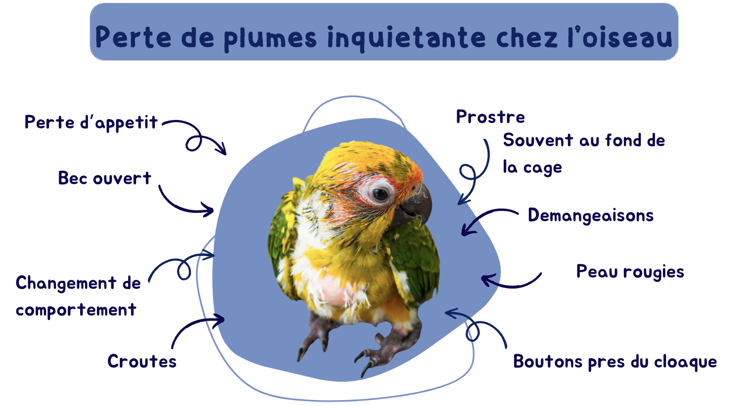 Si vous observez une perte de plumes, faites un historique des conditions de vie et des récents changements de vitre oiseau afin d'identifier une potentielle source de stress ou d'inconfort.