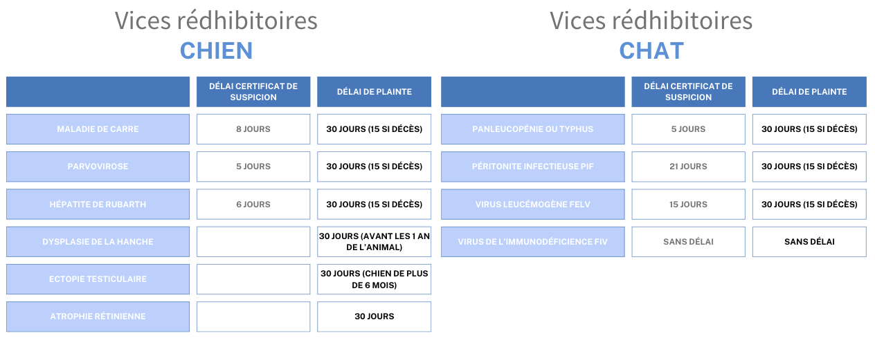 Vice rédhibitoire chat et vice rédhibitoire chien délai